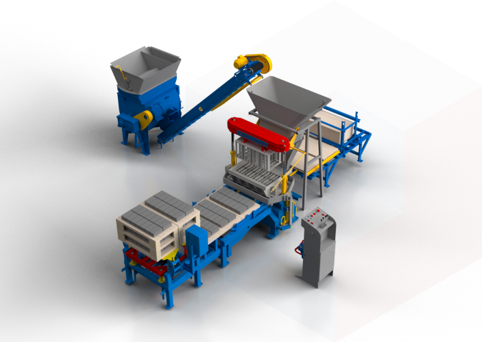 Линия для производства строительных изделий Рифей-РАМ-1000-3,5-350-БП (где 3,5-конвейер крутонаклонный, длина 3,5 метра; 350-смеситель принудительный, объем 350 литров, Б- приемный бункер вибропресса, П-модуль подачи поддонов) представляет из себя, высокопроизводительный, механизированный вибропрес для изготовления мелкоштучных бетонных изделий различной номенклатуры (стеновые блоки, брусчатка, бордюры, кирпич, теплоблоки и др.) более 100 видов.